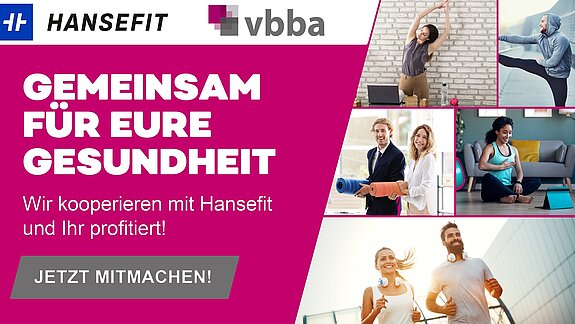Mit Hansefit, unserem starken Partner für Firmenfitness, profitieren vbba-Mitglieder bundesweit von einem attraktiven Rahmenvertrag. Darüber können Sie eine BEST-Mitgliedschaft bei Hansefit abschließen und die vielfältigen Angebote zahlreicher Sport- und Gesundheitspartner nutzen.