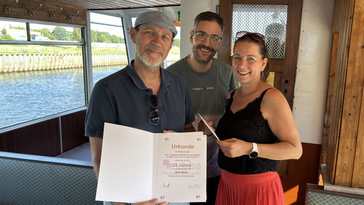 Jubilar Björn Müller (l.) wird für 25-jährige vbba-Mitgliedschaft von Janina Hildebrandt und Michael Kneiske ausgezeichnet. Foto: Bernhard Brügger